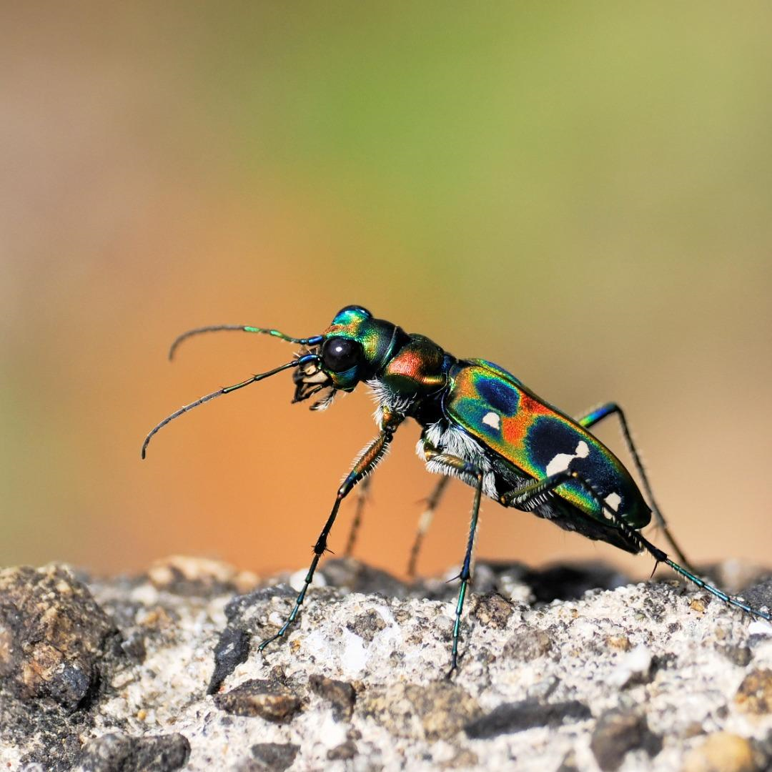 ●ナミハンミョウの光沢が美しく、特徴的な姿がしっかりと際立っています。背景を柔らかくぼかすことで被写体が引き立ち、この昆虫の俊敏さが感じられる素晴らしい写真です。