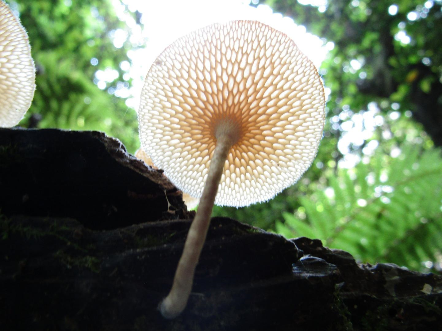 ●美しいだけでなく、傘の裏が管孔状である「網」との名前の由来がよくわかります。林の空への入り口が「きのこの世界」の入り口を示すようで、すばらしい写真です。
